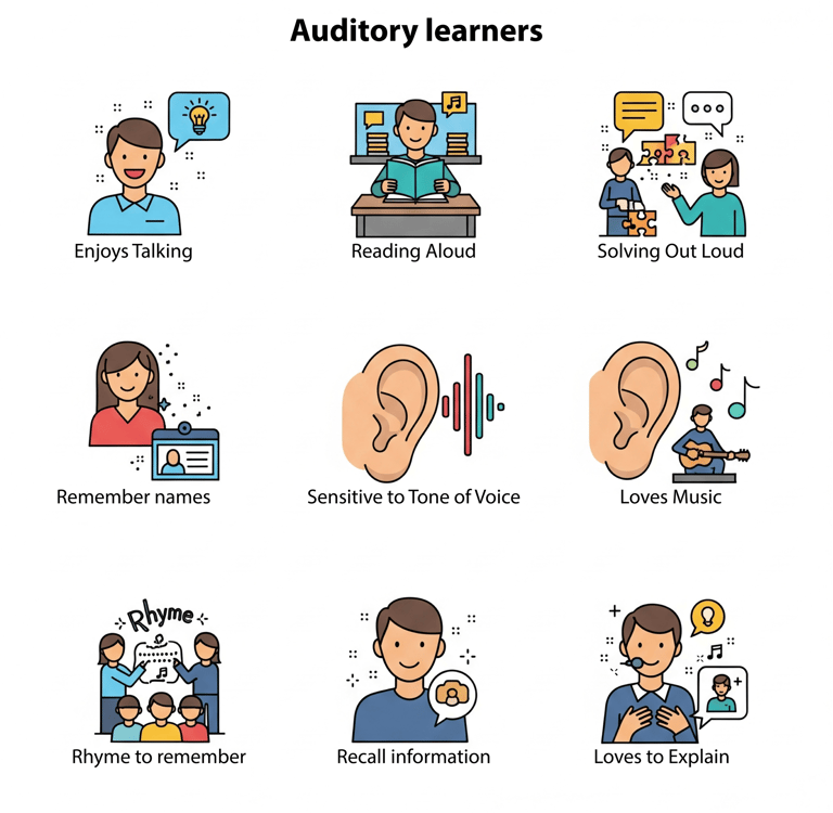 Auditory learners process information best when they hear it. They are often great listeners and can easily remember information that was presented orally.